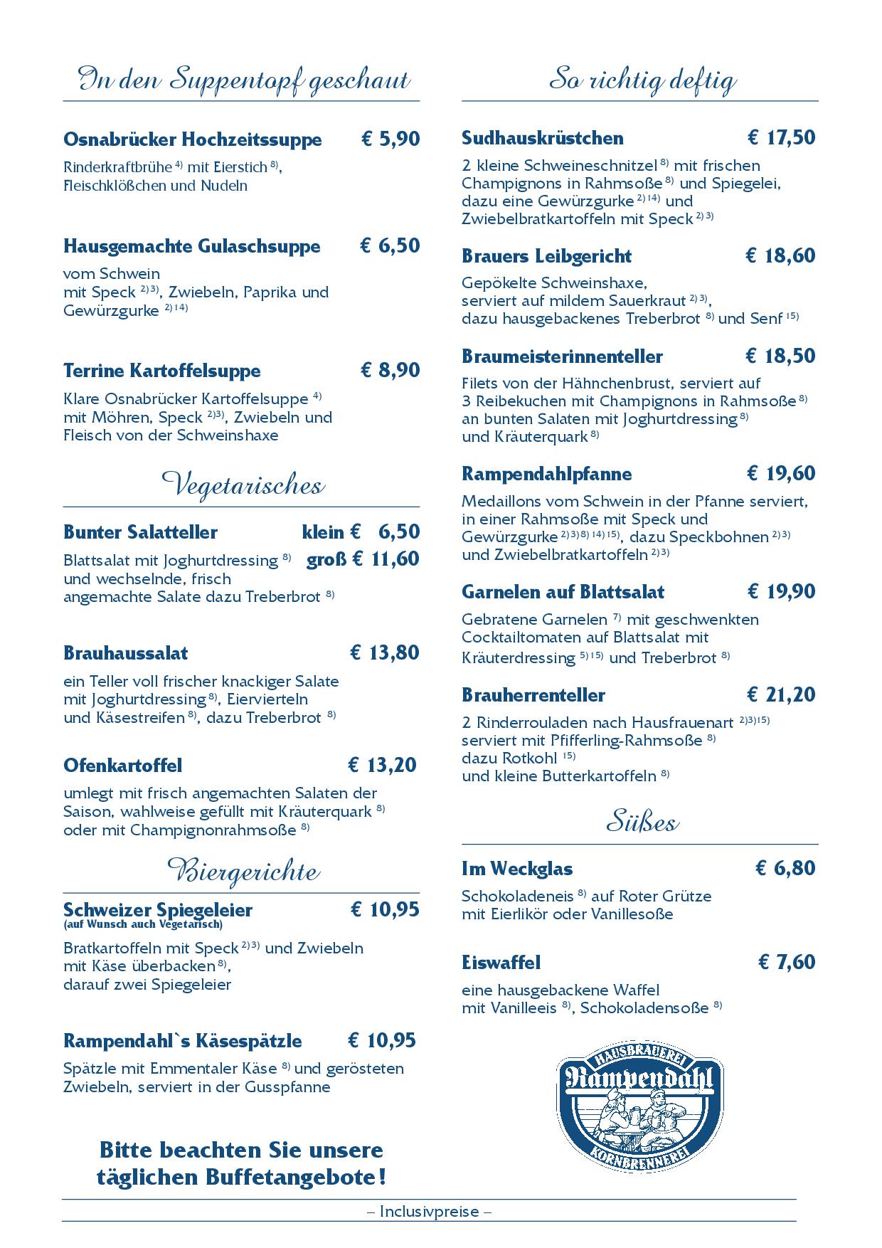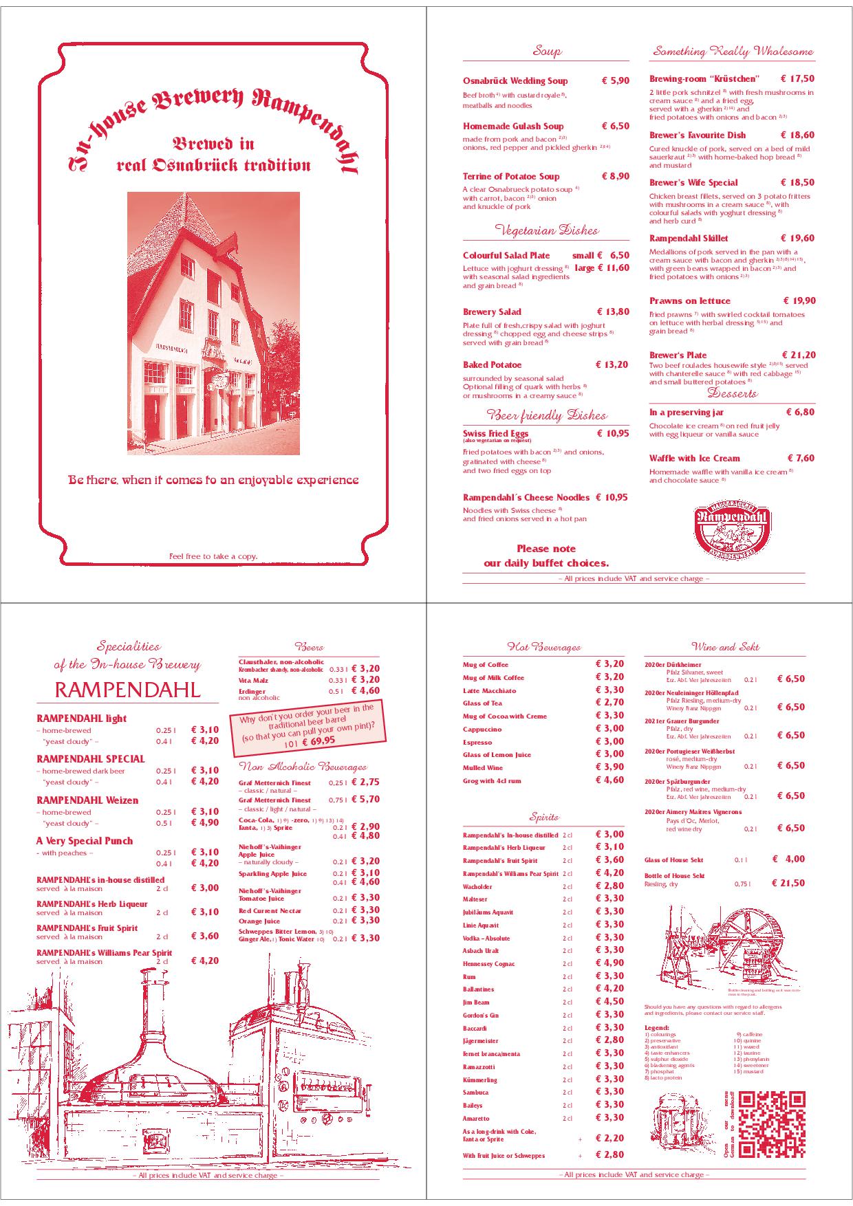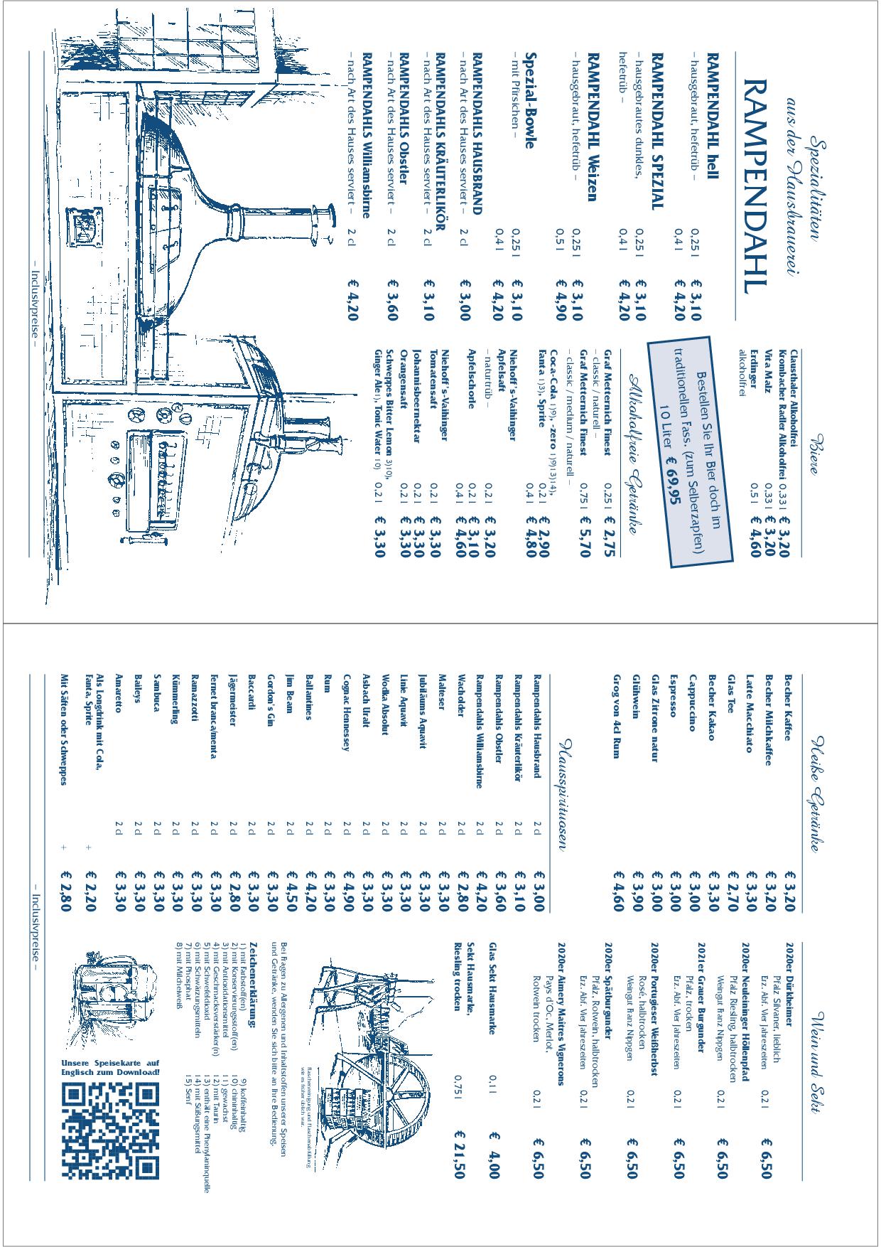 Hier finden Sie unsere Speise- und Getränkekarte und sogar etwas Rampendahl für zu Hause.